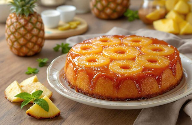 Barre uma forma de bolo com caramelo (de preferência caseiro) e coloque algumas rodelas de ananás em volta. Reserve.